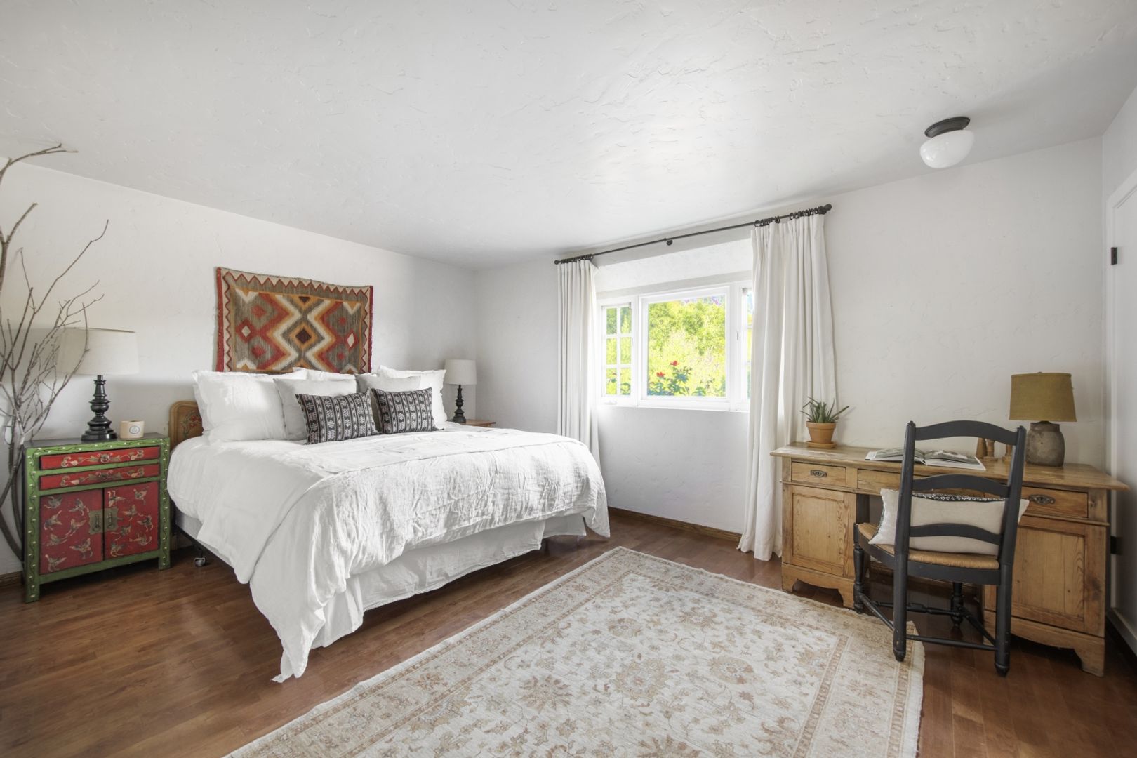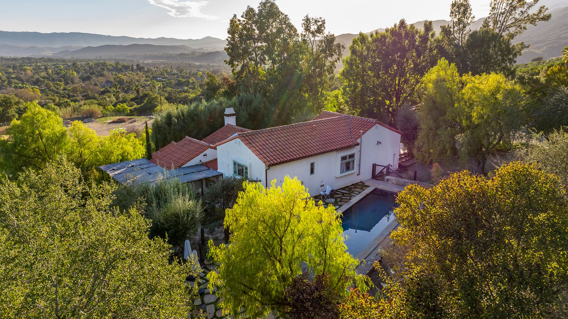 Tucked away on a secluded ridge just minutes from downtown Ojai, this fully furnished Spanish-style estate offers 10 serene acres with panoramic views of the Los Padres Mountains. The main home features soaring ceilings, Mexican-tiled floors, and light-filled living spaces, including two en-suite bedrooms, a spacious kitchen, and multiple lounging areas, including a screening tv room, all designed for comfort and connection.